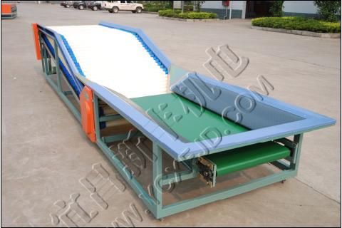 提升和預(yù)選平臺(tái):提升斜工作面是使水果在進(jìn)入預(yù)選平臺(tái)前均勻平鋪,人工預(yù)選平臺(tái)的輸送管在運(yùn)行的過程中帶動(dòng)水果不斷旋轉(zhuǎn),增加可視性。
